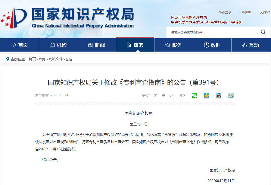 《专利审查指南》最新修改发布,自2021年1月15日起施行!